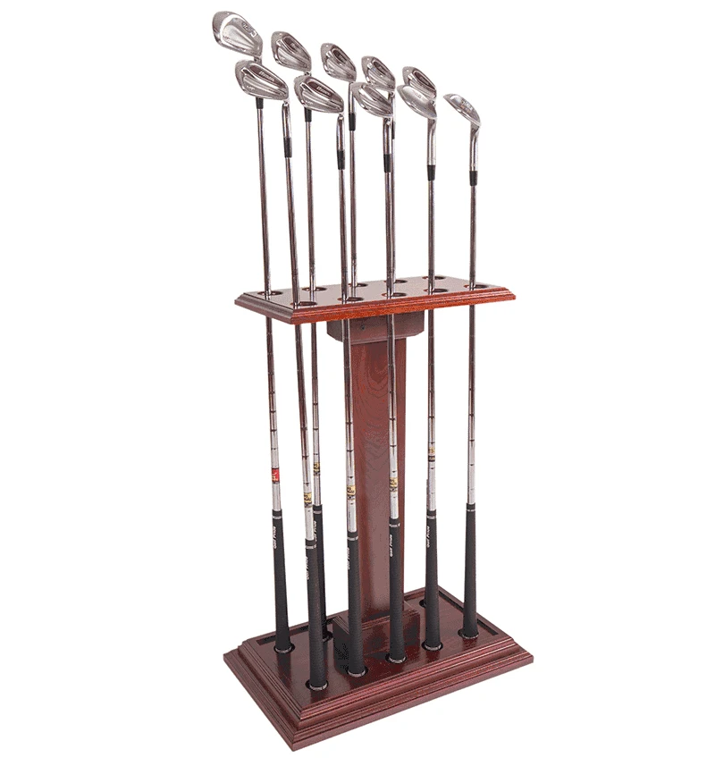 Handcrafted out of solid hardwood, this handsome golf club rack will give your clubs the upscale home they deserve. Whether an assortment of “indoor” clubs for a chip and putt, or an antique set deserving of a place of pride in your home office, this red mahogany stand will make the perfect addition to any golf lover’s favorite room.