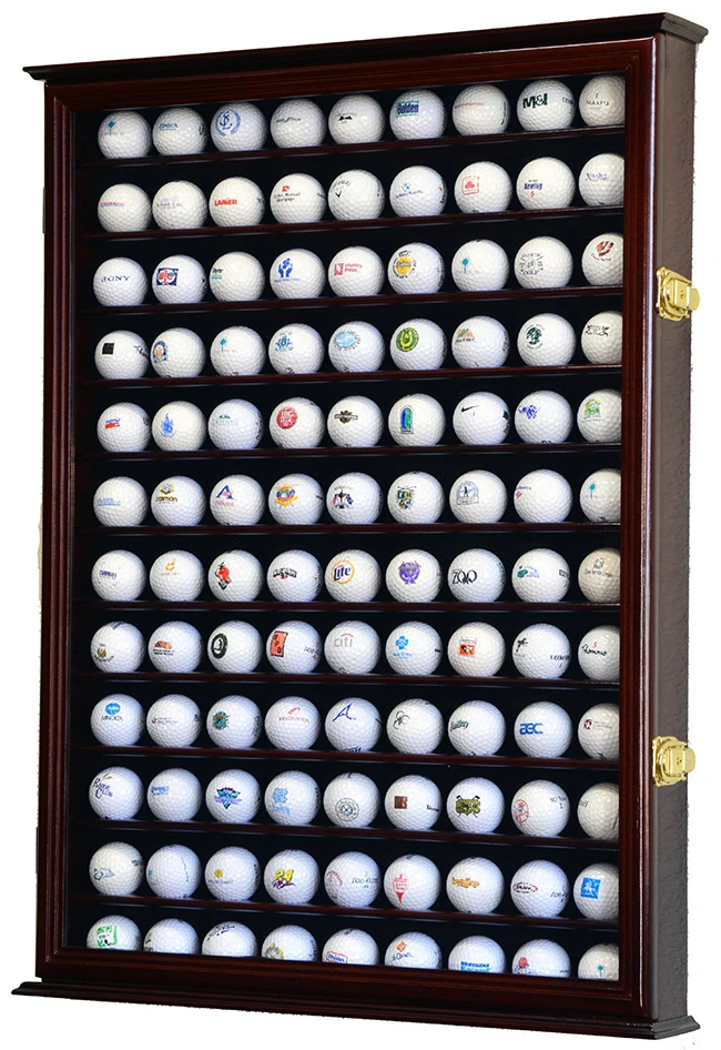 This hardwood golf ball display is great way to display your logo gold balls. A door keeps inquisitive fingers away, as well as dust! A great way to display your memorable shots,golf courses played, or souvenir golf balls. The handsome hardwood display holds 108 golf balls and shelves features individual indentations to secure golf balls. A felt background enhances the look of each ball. Completed with a crown trim design base and header. Brass hinges and door latches. Door is made of 98% UV acrylic. Wall brackets to hang.