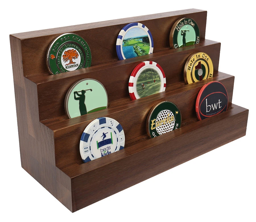 Display 12 of your favorite poker chip golf ball markers with this 3 tier, solid walnut display stand. Accomodates 1.5-2.5 sized medallions and poker chips.