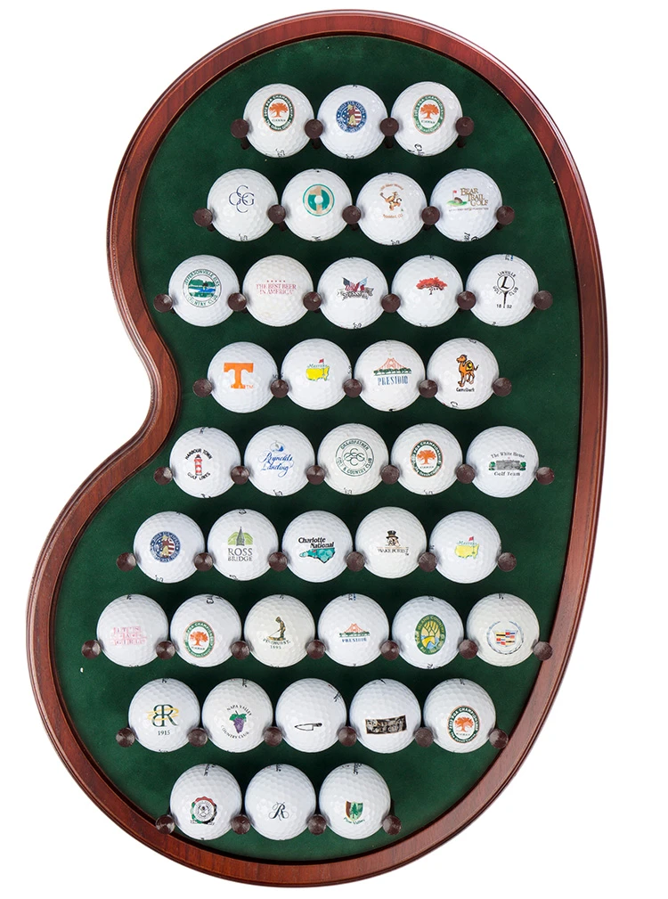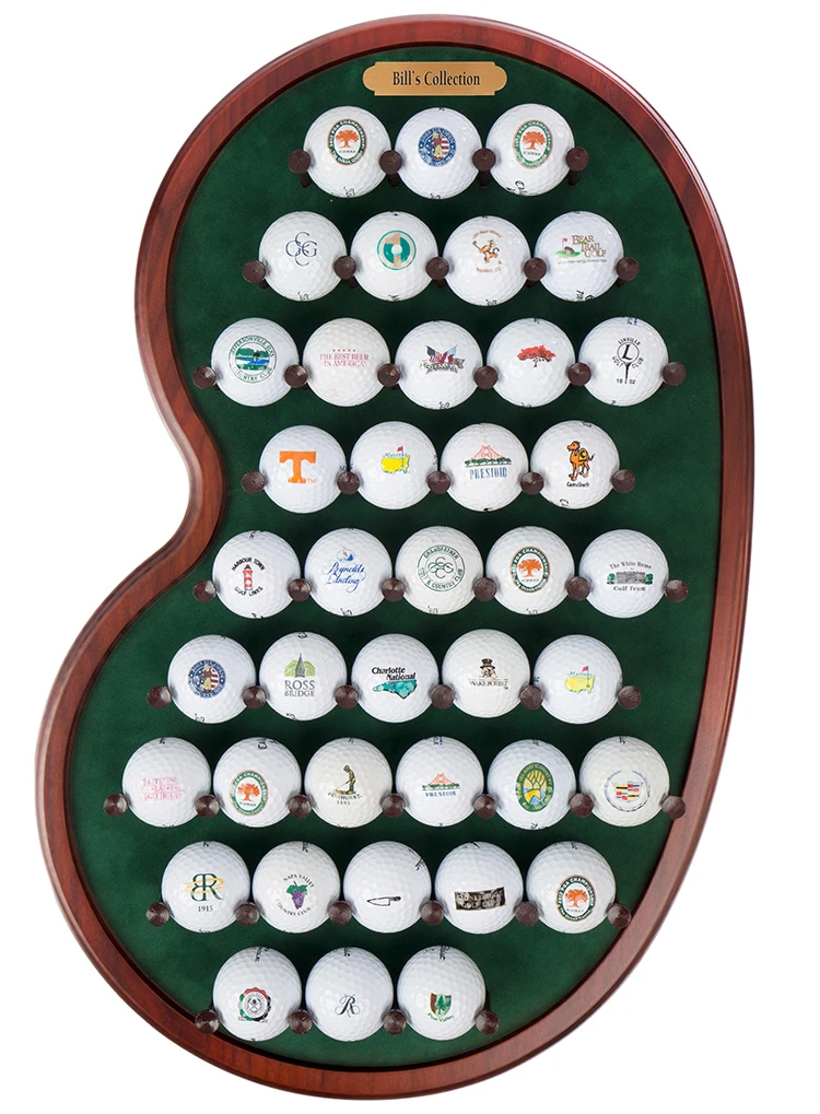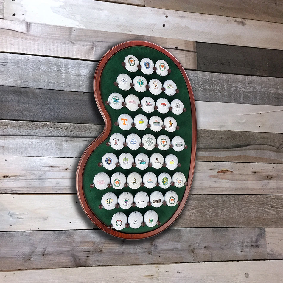 Handcrafted out of solid hardwood, this unique golf ball display will hold up to 40 of your favorites. Held inside the putting green-shaped frame by actual golf tees, this wonderfully unique piece can be personalized as a point of pride on any golf lover’s wall. Available in Cherry and Black finishes.