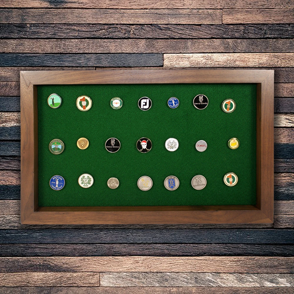 A slightly smaller version of our 100 Golf Ball Marker Display, this handsome frame is handcrafted in the USA from real hardwood. Dark Green felt covers a metal sheet that our magnetic ball marker holders strongly cling to, letting you add, remove and reorganize your collection as it grows. It includes 20 magnets for markers without pegs, and is available in cherry, black, oak, and walnut finishes.