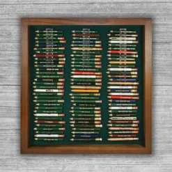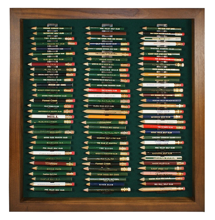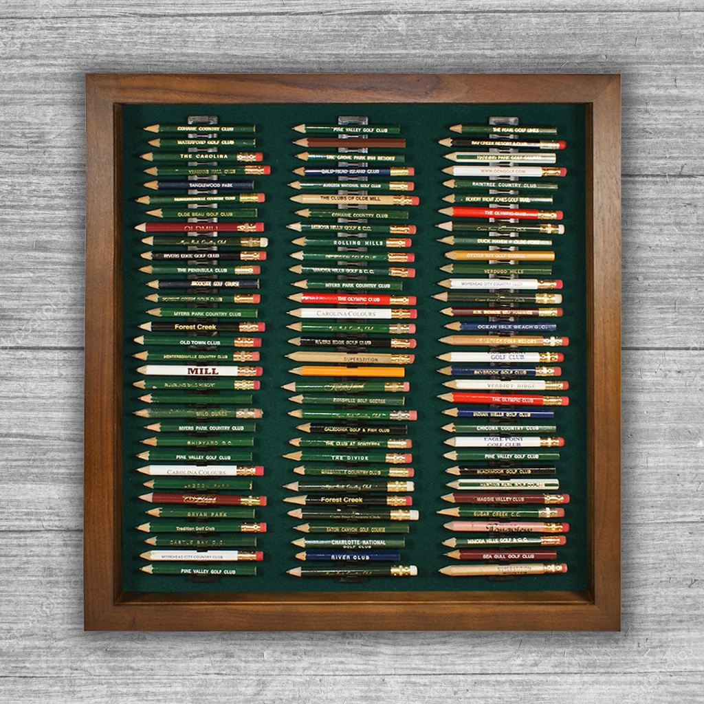 Just because you got them for free doesn’t mean that your golf pencil collection isn’t important. With space for 96 pencils, this handsome frame lets you memorialize your golfing history in a simple, elegant way. An optional 98% UV blocking acrylic cover will protect your golf pencil collection from harmful sunlight, dust, and curious onlookers alike. Holds round and octagonal pencils and is available in cherry, black, walnut, and oak finishes.