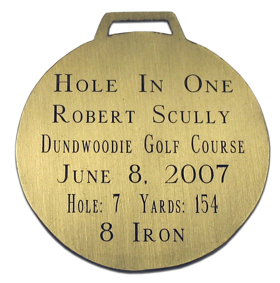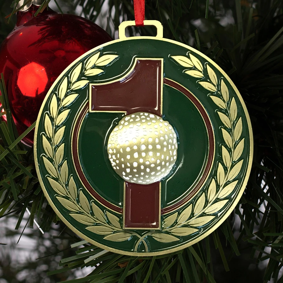 This attractive brass Hole-In-One Ornament will look great on your Christmas tree. This ornament comes engraved with the details of your hole in one on the backside.