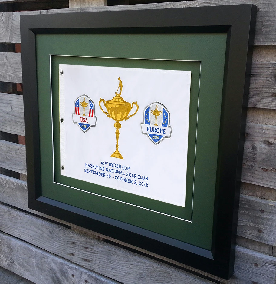 This bold black frame is made in the USA and will be the perfect addition to any den or office. Comes complete with acrylic cover and adhesive strips for you to mount your own pin flag. Double matting accents the pin flag which sits 3/8″ below the surface of the acrylic. Two sizes available for 13×17 and standard 14×20 pin flags.