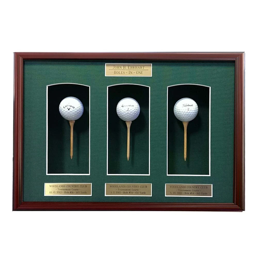 This attractive three ball and tee shadow box is the perfect way to display some of your most prized golf balls or commemorate that special golf trip. Free personalization and shipping. Includes 4 engraved plates with up to 3 lines of text on each plate. Shadow box is dark cherry mahogany. Measures approximately 11″H x 16″W x 3″D.